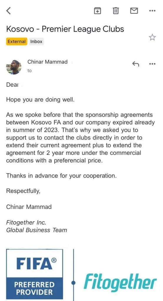 Meqë këtë vit skadon marrëveshja, kompania FIT Together ka kontaktuar zyrtarët në FFK, duke kërkuar kontaktet direkt me klubet për të parë mundësitë dhe interesimin e tyre për blerje të pajiisjeve dhe shërbimit. (Shih foto 2)